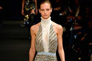 D'emblée, cette tension entre l'appel du collet monté, d'une exquise féminité, et la souplesse d'une chemise ouverte à la corsaire, offre une dynamique à un défilé également riche en matière et en couleurs. Des vestes trois-quarts en pied-de-poule de laine caramel agrémentées ou non de larges cols de fourrure en renard dévoilent une robe de dentelle resserrée à la taille au cou mais fendue entre les seins et à la cuisse. Plus loin, du cuir, du velours, des vestes Bombers, mais aussi les sequins et paillettes de la femme du XXIe siècle et une série de manteaux courts de fourrure de renard très pop malgré leur ton pastel, bleu, rose, ou blanc.