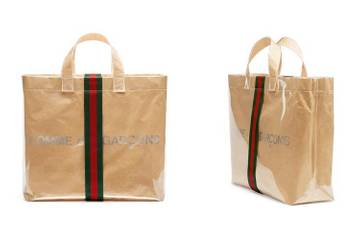 Alessandro Michele et Rei Kawakubo, la fondatrice de la marque japonaise Comme des Garçons, s’unissent pour une collaboration exclusive. Réputée pour son approche design et minimaliste de la mode, la marque japonaise s’associe au style éclectique et ornemental de Gucci. Ensemble, ils dévoilent un sac shopper Comme des Garçons. La pièce unique est personnalisée avec un ruban vertical vert-rouge-vert, signature de Gucci.